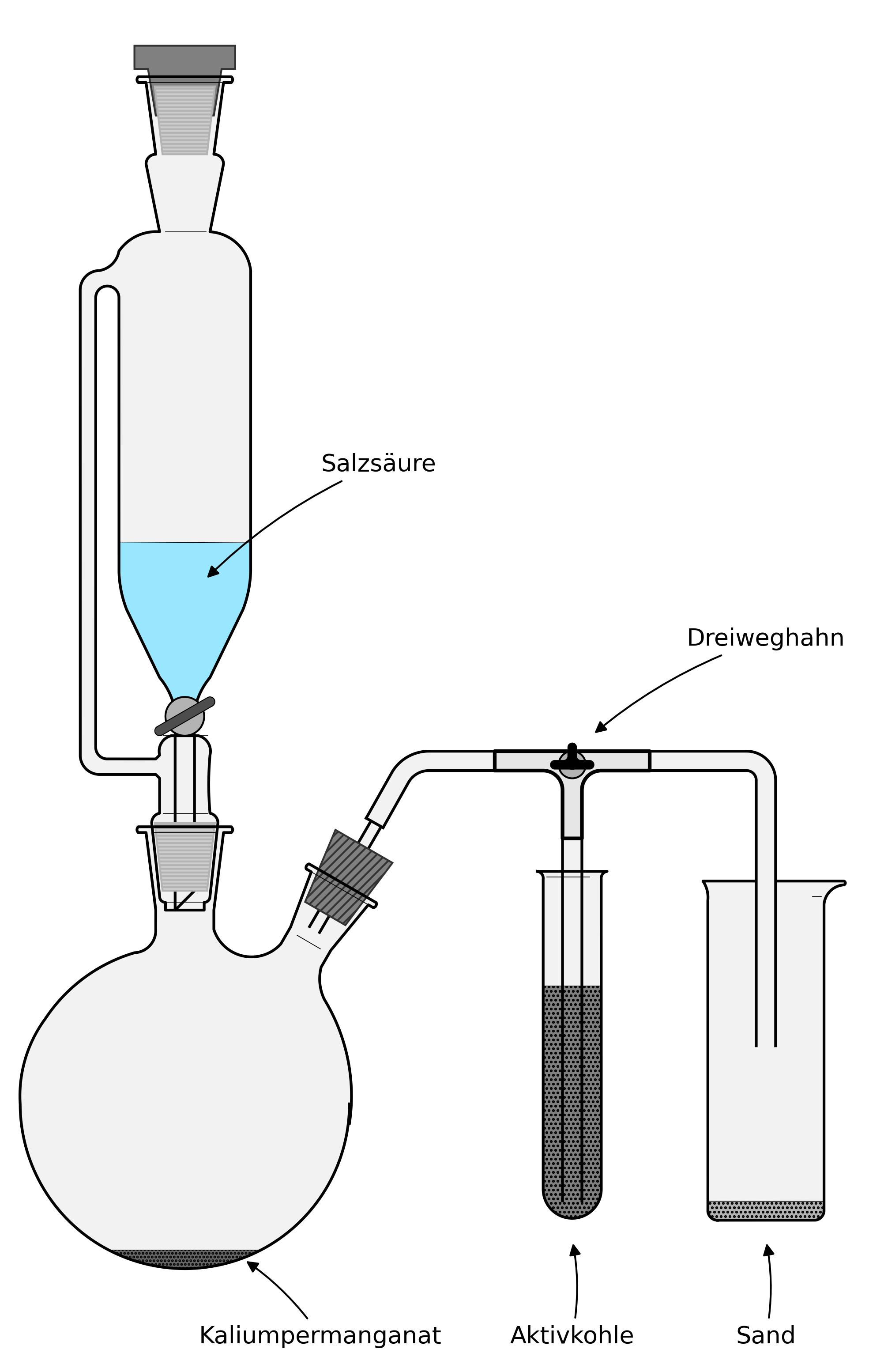 Herstellung von Chlorgas. Die Verzweigung zur Aktivkohle ist optional. Die Aktivkohle verhindert das Entweichen von Chlorgas, der Dreiweghahn darf aber nie ganz geschlossen werden. Zu Beginn ist der Dreiweghahn wie gezeigt so eingestellt, dass das Chlorgas in den Standzylinder fliesst