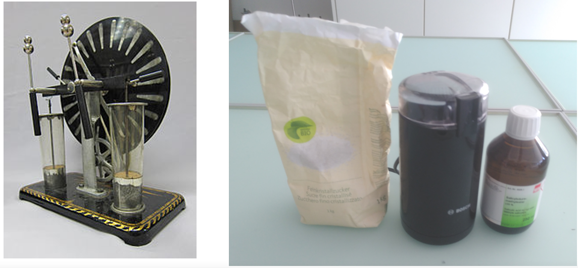 Mit der Influenzmaschine gelingt es, Kugeln elektrisch so stark aufzuladen, bis Blitze entstehen. Diese Blitze entstehen, weil negative Ladungsträger, also Elektronen, von der negativ geladenen Kugel zur positiven hüpfen (und gegen Moleküle in der Luft prallen). Genau dieselben Blitze entstehen auch, wenn man Moleküle zerschmettert. Ein Hinweis, dass in allen Molekülen dieselben geladenen Teilchen, also auch Elektronen, drin sein könnten. Beim Zerschlagen der Moleküle entstehen geladene Bruchstücke. Sobald der Abstand genug gross wird, wird stellenweise eine Durchschlagsspannung erreicht und es schlagen Blitze durch. Dabei werden die Luftmoleküle unter Farberscheinung ionisiert und angeregt (man kann zeigen, dass die Lichtblitze mindestens teilweise von angeregtem Stickstoff stammen).
