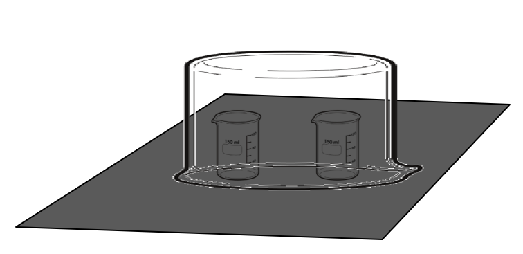 - Das "Experiment wird gefragt", worum es sich bei dem Rauch handle. Auf die dunkle Unterlage werden die Buchstaben "NH₄Cl" gelegt und daneben zwei kleine BG mit konzentriertem Ammoniak bzw Salzsäure gestellt und mit der grossen Kristallisierschale zugedeckt. NAch einer Weile wird die Kristallisierschale entfernt und "das Experiment gefragt" (die Buchstaben mit der Pinzette entfernt)