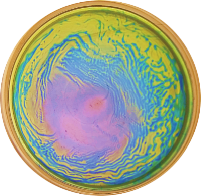 Verfärbung entsteht nur mit KOH, also müssen die OH- -Ionen die Verfärbung bewirken. Um das KOH-Plätzchen breiten sich blau-violette Farbwellen aus (Phenolphthalein schlägt auch um). Während das KOH sich löst, kann ein Tropfen Salzsäure oder NaHSO₄ ("HCl") etwas entfernt vom Plätzchen in die Schale gegeben werden. Es entstehen Flüsse zwischen den beiden „Zentren“ mit unterschiedlicher Azidität, die farblich schön sichtbar sind.(Effekt der Salzsäure muss man hier noch nicht diskutieren)