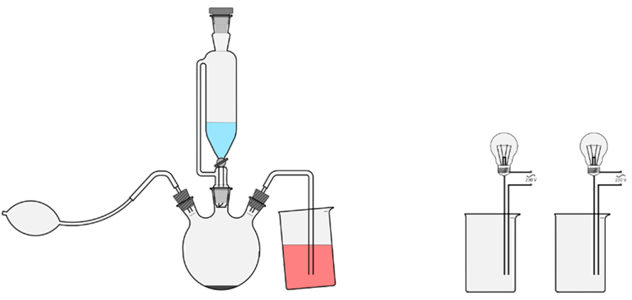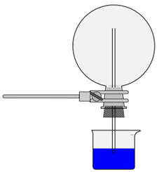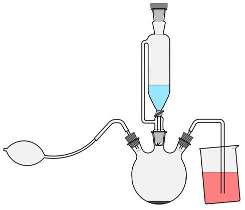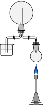 - Ein 1L-Rundkolben wird mit einem doppelt durchbohrten Stopfen mit zwei kurzen Glasrohren bestückt.